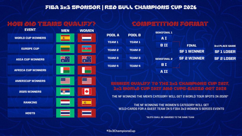 The tournament will once again feature eight men’s teams and eight women’s teams. Qualification is based on specific sporting criteria, including world champions, continental champions, top-ranked nations and the host country. In addition to the title, the champions in each category will secure direct qualification to the FIBA 3×3 World Cup 2027, the FIBA 3×3 Champions Cup 2027 and the Cups-based Olympic Qualification Tournament in 2028.